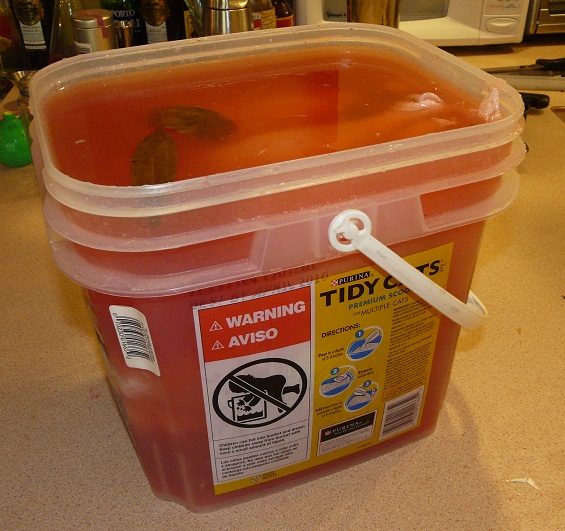 We noticed that our container (hey, it’s not like it had used kitty litter in it, but it does add a certain amount of unwholesomeness, doesn’t it?) had a helpful illustration. Be advised: this container is not fit for brining babies.