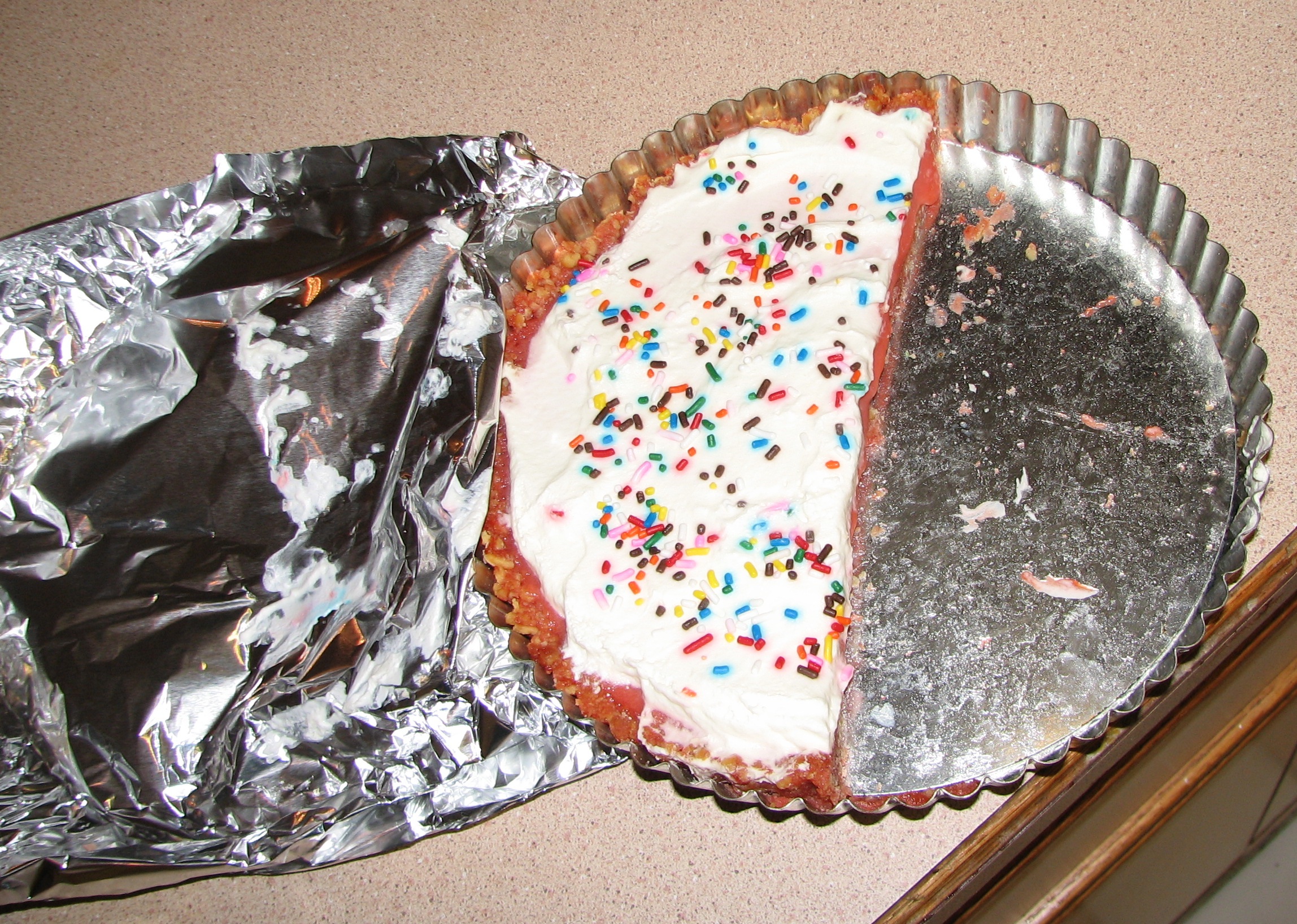 To frost the tart, we used whipped cream. (Beat whipping cream with a bit of confectioner’s sugar until it is stiff. Spread on tart.) Then for that classic Pop Tart look, we covered the whole thing in rainbow sprinkles. Slice and serve. We recommend storing the leftovers in foil for a classic look.