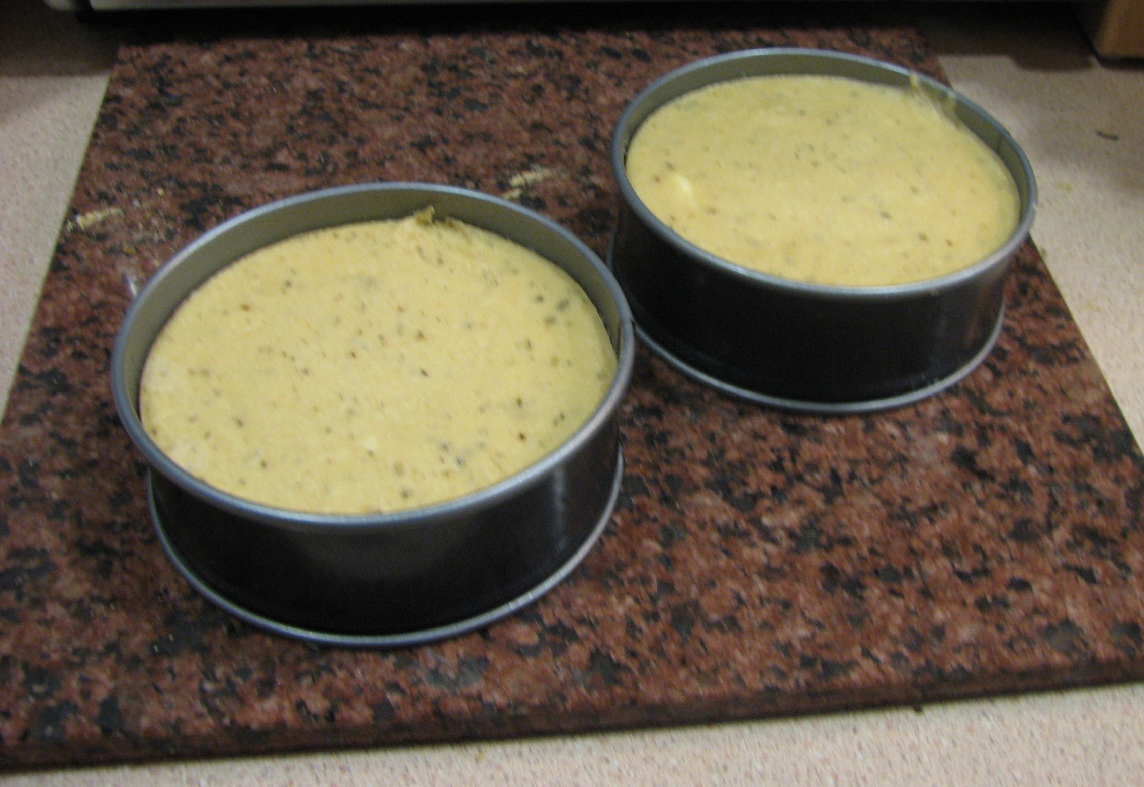 She put 2/3 of a pound of cream cheese into the food processor and mixed it until it was somewhat smooth.  Then she mixed in 1/4 cup of brown sugar.  Next she blended in an egg.  Finally, she added the chicken mousse and processed briefly.  She scraped the mixture into some waiting spring-form pans which had been coated with melted butter and dusted with graham cracker crumbs.  Then she wrapped the bottom of the pans in aluminum foil and placed them in the oven onto a pre-heated baking sheet full of water.  She cooked them until the centers were just barely stiff.  Alex’s cheesecake was still cooking in the oven, so Beth moved her cheesecakes to a 200 degree toaster oven to let them cool slowly.