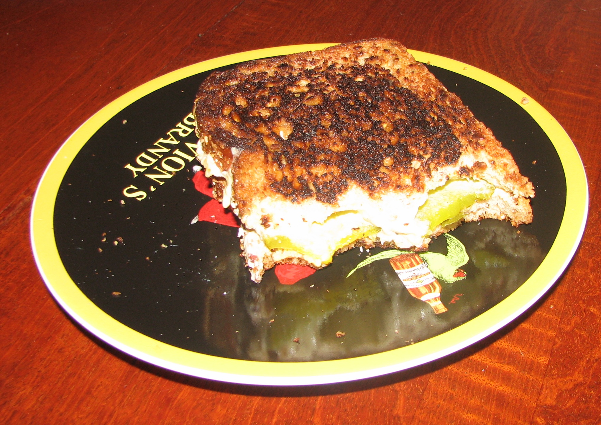 Beth: Still not right.  Too much seasoning.  Well, I used tuna as my inspiration, so I should eat it like tuna.  On a sandwich with pickles.  *Time passes.*  Okay, that was pretty good as a sandwich.  Maybe I’ll try it grilled.  *Time passes.*  Mmm, okay, that is definitely the right way to eat this thing.  There is still either too much seasoning or too much sugar, but it’s pretty good.  I guess I am bringing a chicken cheesecake sandwich to work for lunch every day this week until it is gone.  I can’t grill it there, but I can toast it.