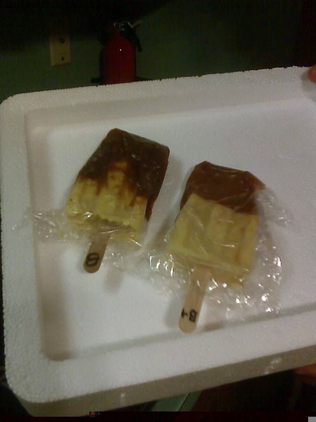 The barbeque sauce didn’t freeze very well, so a lot of it ended up sticking to the plastic wrappers. However, most people agreed that this sauce-loss was actually a good thing that brought the corn and sauce to the right proportions. The corn-pops were a big hit with the crowd, although the barbeque sauce was too spicy for some, and the corn part was a little dense and dry. These also deserve another experiment.