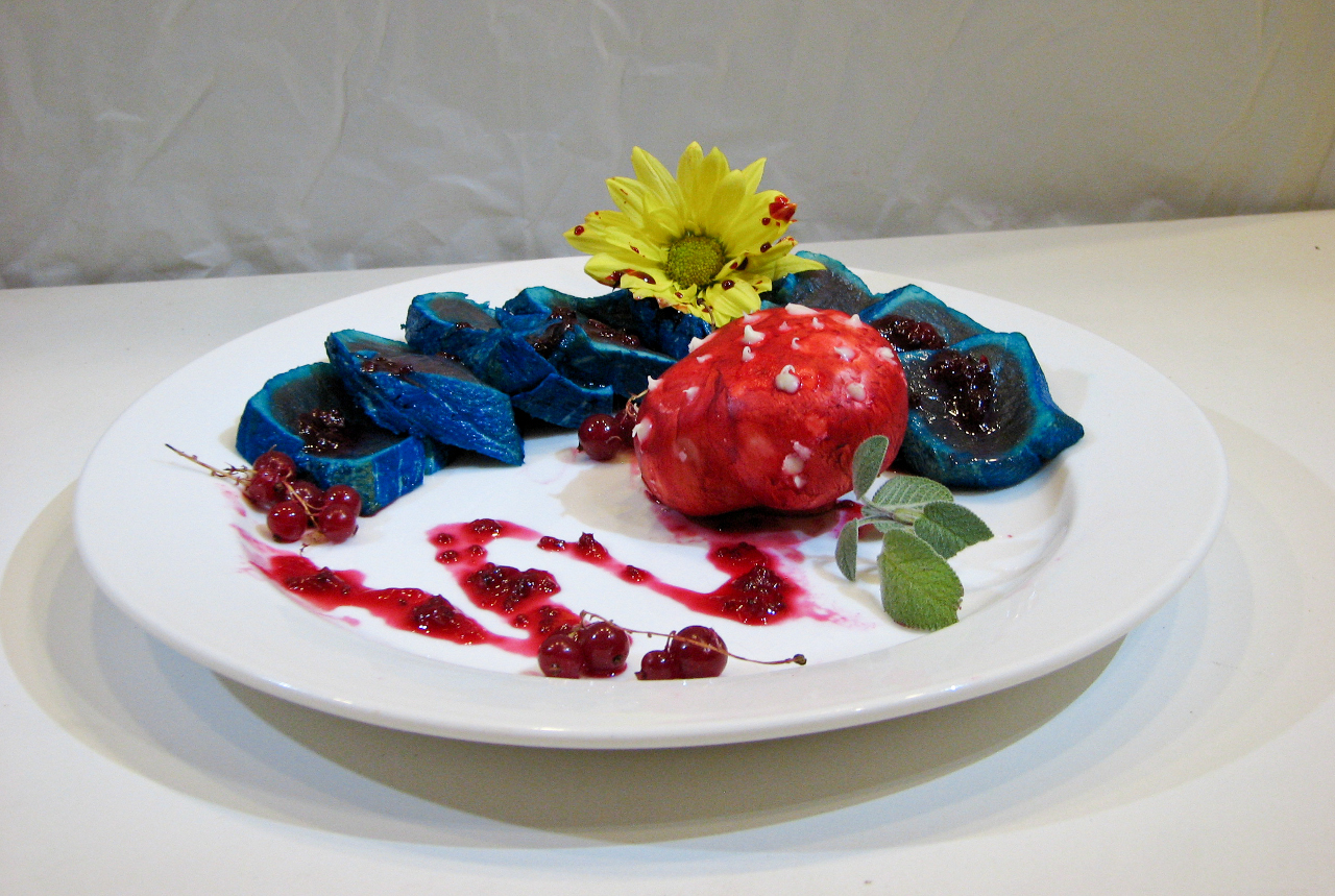 Drizzle with a reduction of smurfberries (we couldn’t let those hard-won berries go to waste!). Garnish with a red mushroom house.