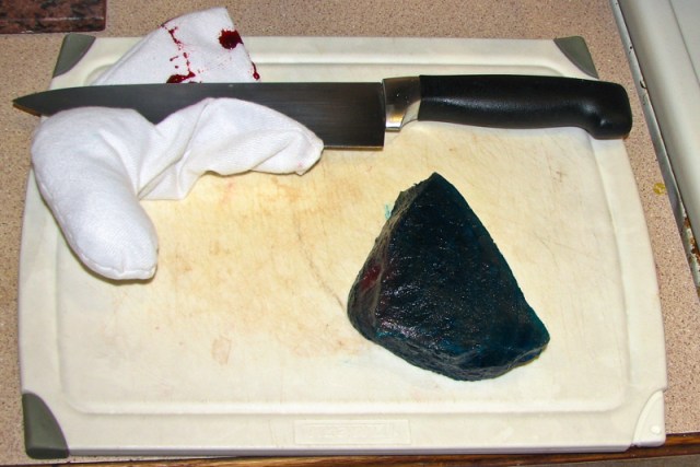 • We thought about using steak, since all of us are steak fans but only some of use are fish fans. The problem with steak is that when you sear it it turns brown (hard to dye), whereas tuna turns white (easy to dye). We tried applying the dye both before and after searing, and it seems to work equally well either way. For a while we were considering using steak, but instead of dying it, wrapping it with a blue fruit roll-up skin.