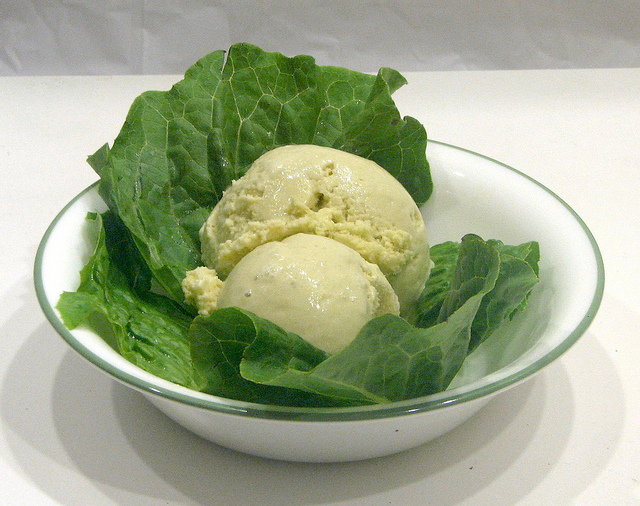 Our friend Peter came up with this idea: it’s bleu cheese ice cream, cayenne pepper sauce hot fudge and chicken-flavored whipped cream sprinkled with chopped celery!