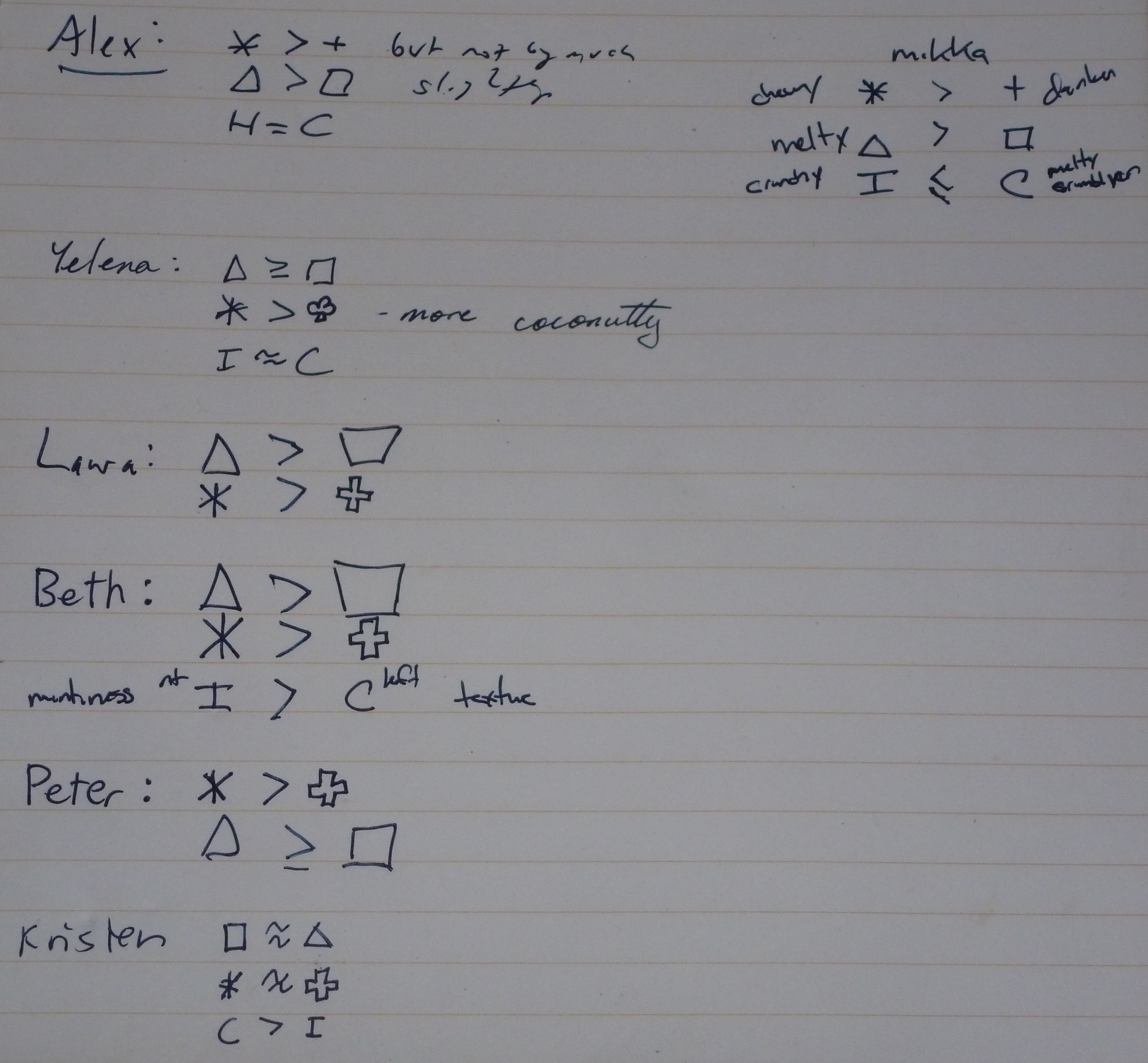 Beth conducted a follow up study with 5 new tasters a week later, with nearly identical results. (Although this time, one person prioritized the Samoas’ superior chocolate-coconut flavor over the chewy texture of the Caramel Delights.)