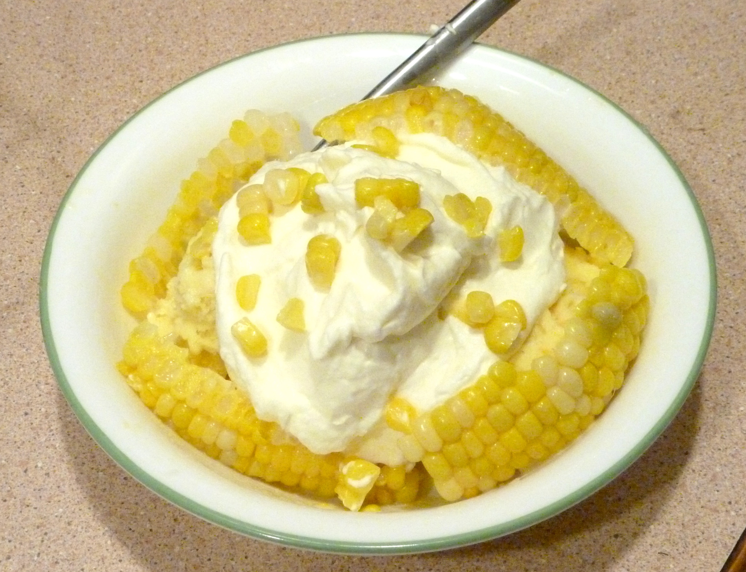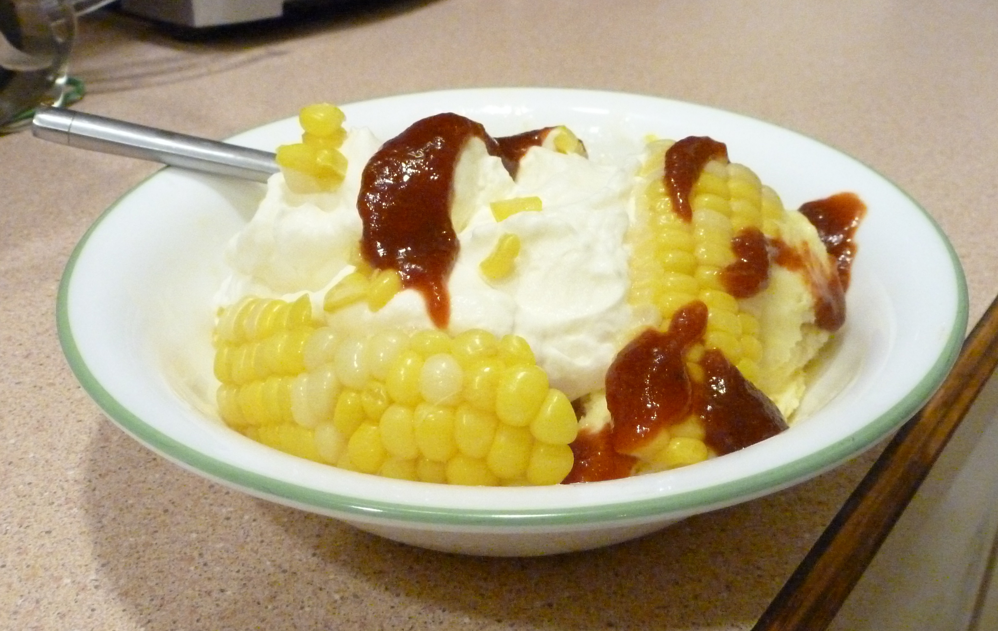Once the corn was cooked, we sliced off a few large strips of kernels and arranged them in the bowl as one might use a banana in a banana split. The rest of the kernels we separated and used as sprinkles. We tasted our completed concoction. Then at Cheryl’s suggestion we added some barbecue sauce in place of hot fudge and tried it again.